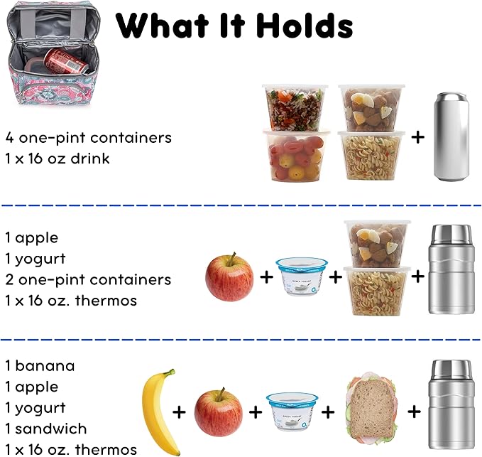 - What It Holds — Insulated lunch box holds a 12-16 oz drink, a yogurt cup, a fruit cup, a small cottage cheese container, an apple, and 2 frozen gel packs
