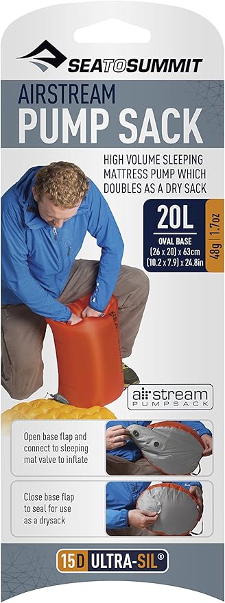 - Two-in-one 20-liter dry bag functions as both dry storage, and as a pump sack for Sea to Summit sleeping pads