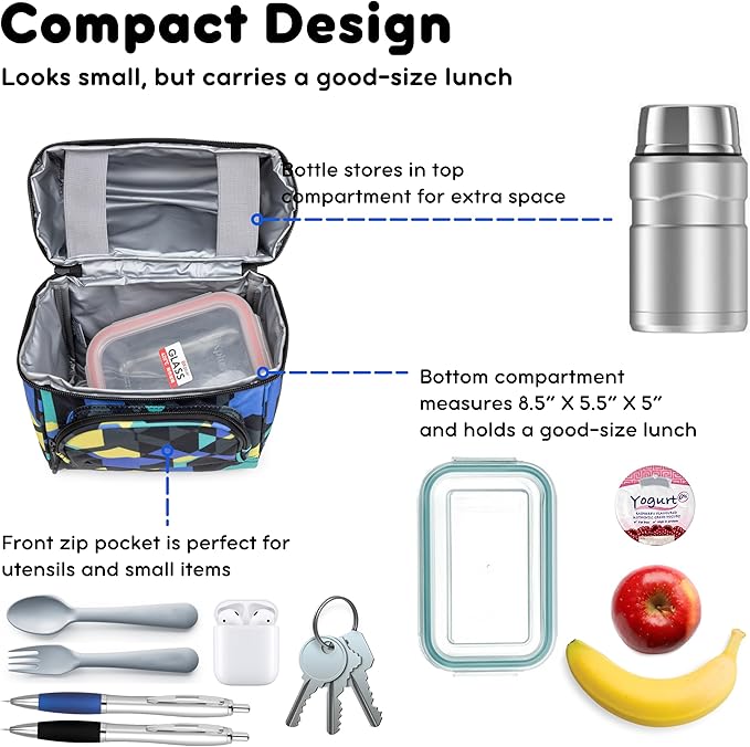 - Versatile – Works well as a boys lunch box for school, a kids insulated lunch box, or as a compact middle school lunch box. For age 8 years and up