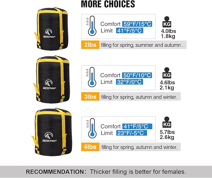 - Temperature Range: 4lbs filling 80% cotton lined adult sleeping bag is comfort in 41°F/5°C, and fits temperature range in 32-59°F/0 - 15°C. 3lbs filling sleeping bags is comfort in 50°F/10°C and fits temperature range 41-68°F/5-15°C. Females are recommended to choose the thicker sleeping bags.