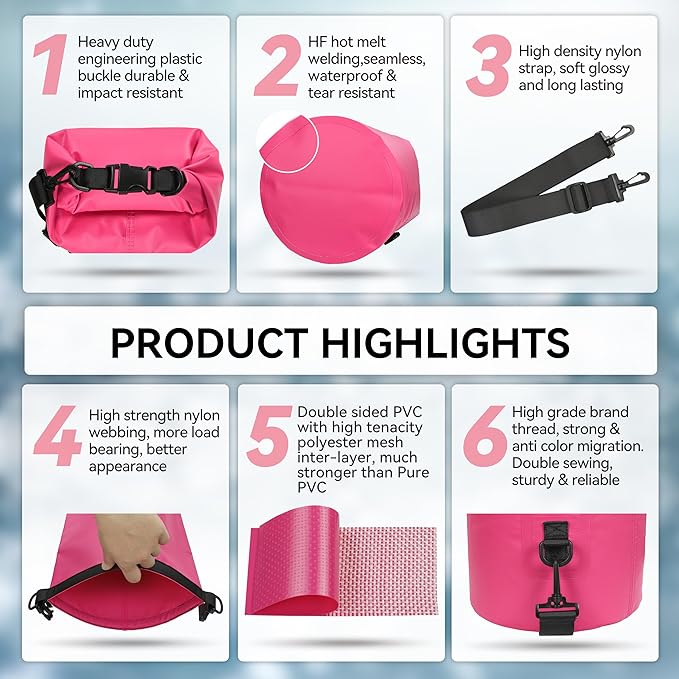 - Floatable and Trackable: The dry sack can float on water without sinking after being rolled up and buckled, so you can quickly track and retrieve your stuff. The D-ring and strap on the bag make it easy to attach to the boat, keeping your stuff always with you without getting lost, allowing you to enjoy thrilling outdoor activities with peace of mind.