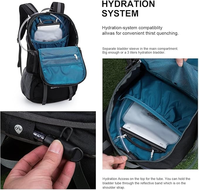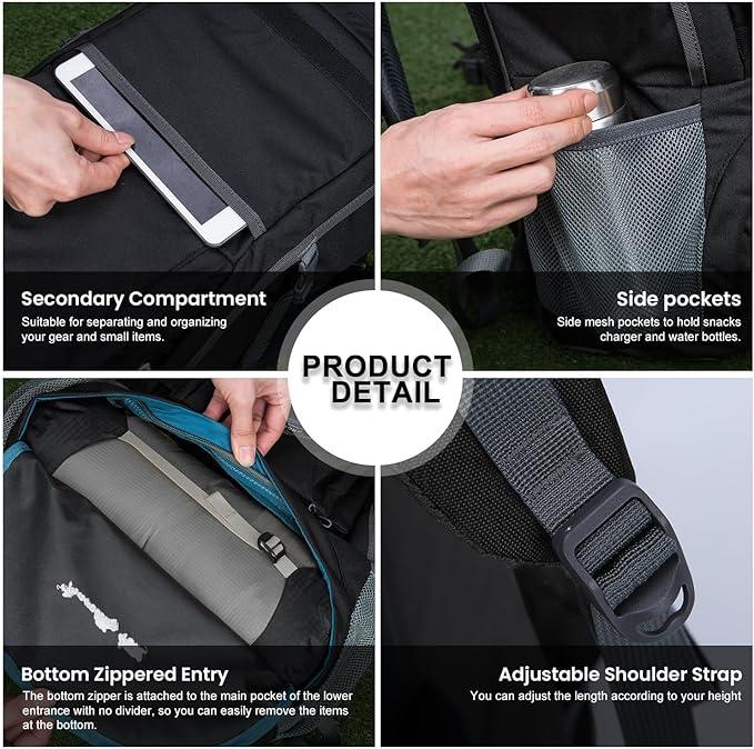 - Well-designed details: This outdoor backpack has many clever and convenient designs. The bottom compartment provides direct access to the main compartment; there is also a dedicated compartment for a water bladder (WATER BLADDER NOT INCLUDED), In addition, various shrink straps can also carry camping equipment such as trekking poles, sleeping bags and tents.