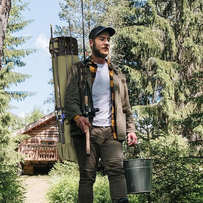 - 【Fishing Pole Bag Capacity】Fishing rod case bag green holds 5 rods and reels outside and small tackle, gear and chair inside. You just need ONE fishing pole bag to organize all your fishing equipment.