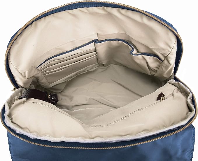 - Double locking zippered main compartment has 5 RFID blocking card slots, a passport slot, 2 zippered wall pockets and a drop pocket for glasses or other quick grab items, Main compartment is large enough to fit a tablet
