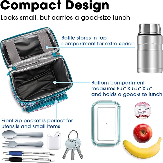 - Bottle In Top — Your drink bottle secures in the top to keep it from squishing your sandwiches. Front pocket of this compartment lunch bag is perfect for carrying condiments