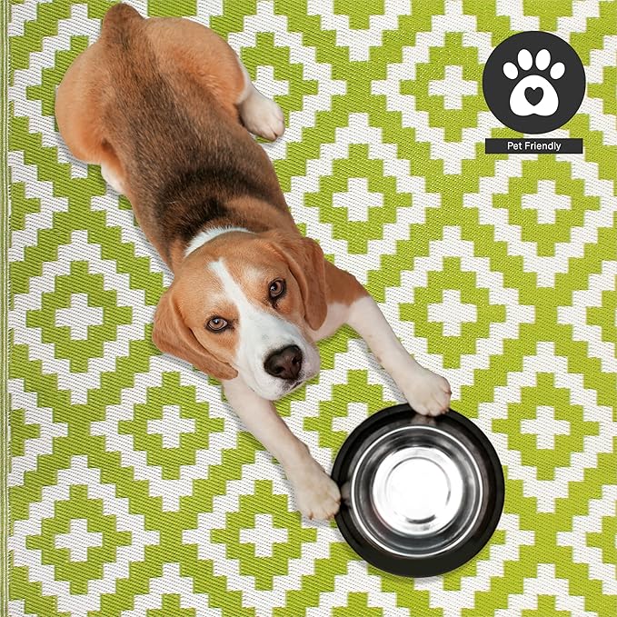 FH Home Outdoor Rug - Waterproof, Fade Resistant, Reversible - Premium Recycled Plastic - Geometric - Patio, Deck, Porch, Balcony, Laundry Room - Aztec - Green & White Crease Free - 4 x 6 ft