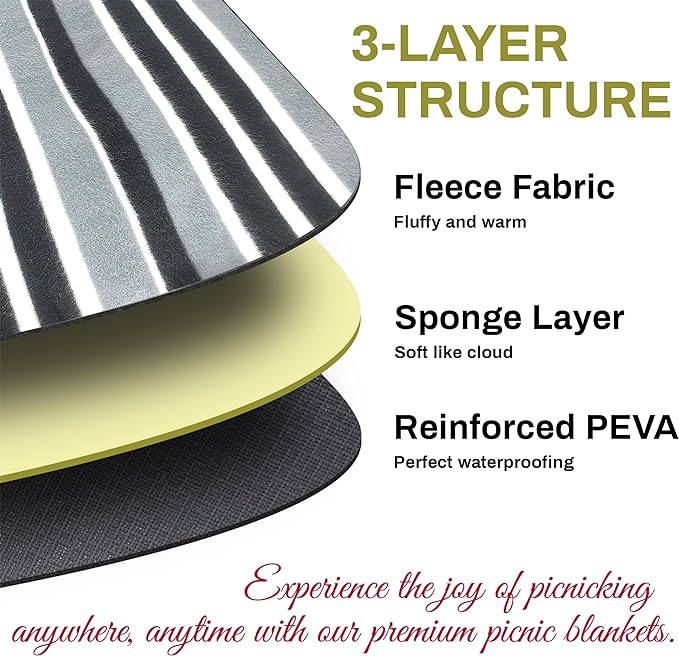 - Soft 3 Layer Outdoor Blanket: The high-quality, 3-layer design with soft fleece on top, PEVA on the back, and selected sponge in the middle, makes the large waterproof outdoor blanket soft. The PEVA layer on the back is waterproof, sand proof and easy to clean. It is the best blanket for picnic.