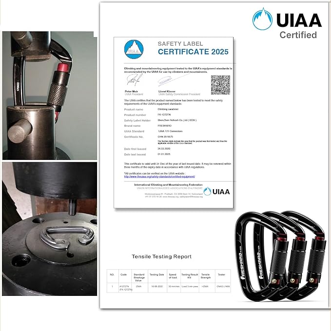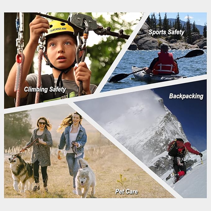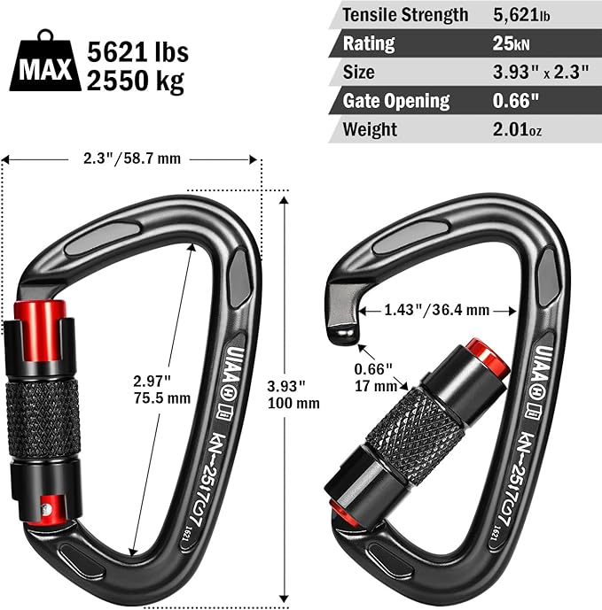 - 【STRONG CARABINER】-UIAA certified, Major axis strength 25kN (5,621lbs), Cross-loaded at 7kN, Hot forged construction rated for tree climbing, hiking, rappelling, rescue, locking big adult dogs, hammock, swing etc
