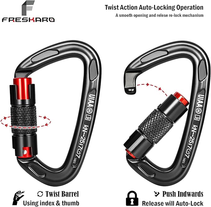 FresKaro UIAA Certified 25KN Auto Locking Climbing Carabiner Clips, Twist Lock, and Heavy Duty Carabiners for Rock Climbing, Rappelling, and Mountaineering, D Shaped 3.93 Inch, Large Size, Black