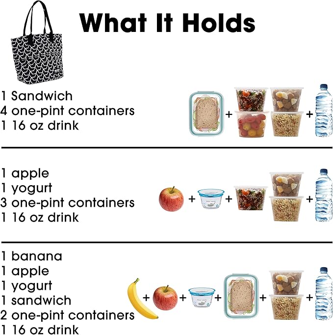 - Packs Typical Lunch — Cooler lunch bag holds a 12-16 oz drink, a yogurt cup, a fruit cup, a small cottage cheese container, an apple, and 2 frozen gel packs