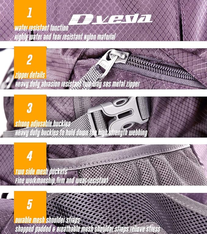 • šŸšµā˜… Enjoying Your Hiking Backpackā˜… :Dveda 35L hiking backpack ideal for Disney day trip, day travel, overnight trip, camping, day hiking and vocation. Great hiking backpack for women and men. Its rip-resistant nylon construction sheds rain and resists wear better than cheaper polyester. Our Products have 24 moths Replacement Service and 100% Satisfaction, If you are not Satisfied with your Purchase for Any Reason, Please Feel Free To Contact Us.