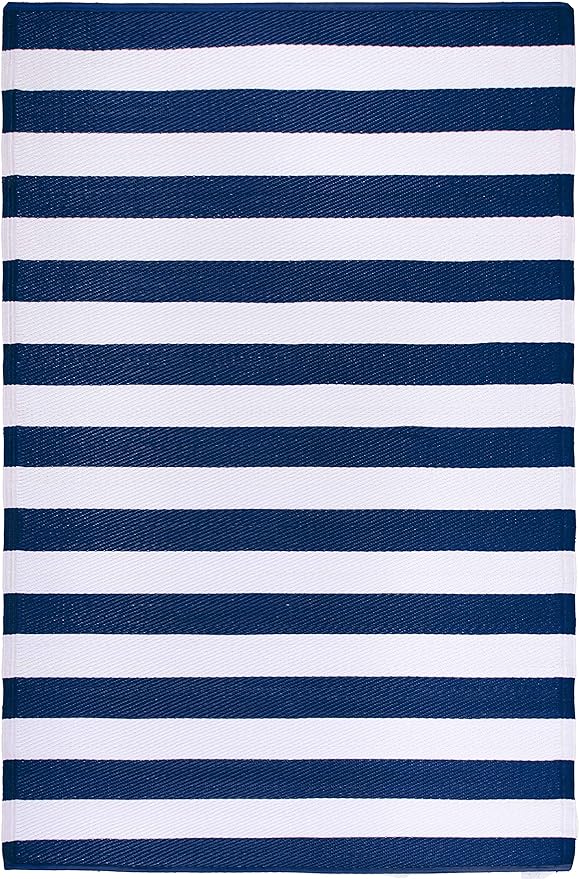 FH Home Outdoor Rug - Waterproof, Fade Resistant, Reversible - Premium Recycled Plastic - Striped - Patio, Deck, Porch, Balcony, Laundry Room - Brittany Stripe - Blue & White Crease Free - 4 x 6 ft