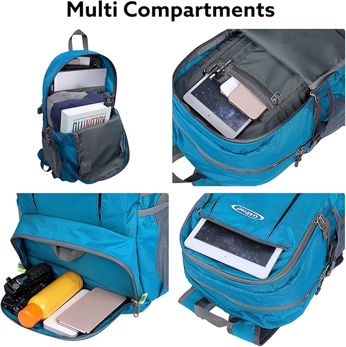 - 【Multi-Compartment Design】 This foldable backpack has 40L storage space. Featuring one main zipped compartment, a second large zipped front pocket, one front zipped hidden pouch, one front zipper compartment, and 2 side pockets. One separator and one small zippered pocket in the main compartment to organize your travel essentials or daily items.