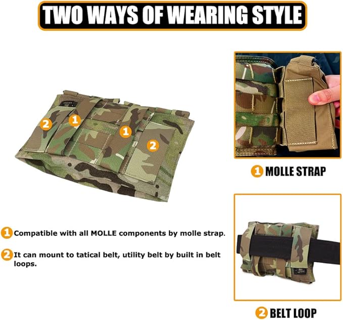 - Two different ways of wearing :1. It can mount to tatical belt, utility belt by built in belt loops. 2.compatible with all MOLLE components by molle strap .Note :If you you don't know how to use molle strap,please check the video we uploaded.