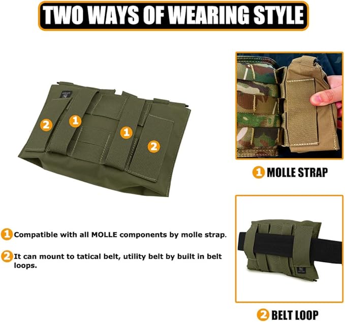 - Two different ways of wearing :1. It can mount to tatical belt, utility belt by built in belt loops. 2.compatible with all MOLLE components by molle strap .Note :If you you don't know how to use molle strap,please check the video we uploaded.