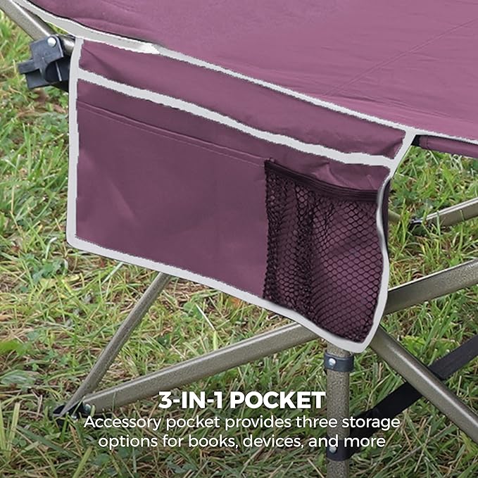 - ULTRA COMFORTABLE - The open sleeping cot dimensions are 28 inches wide, 75 inches long, and 18.5 inches high so you can sleep comfortably on your side or back; an elevated headrest ensures comfort with or without a pillow.