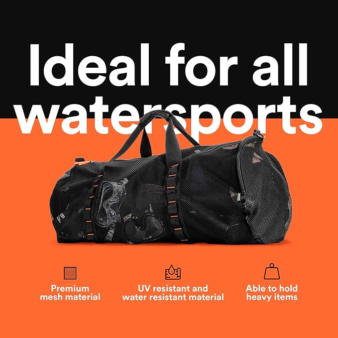 • QUALITY MATERIAL & DURABLE CONSTRUCTION HOLDS 30LB – Unlike other mesh duffle bags in the market, we only use quality mesh that is UV resistant and able to withstand bending and stretching. This allows it to hold all sizes of gear effortlessly. This bag is also reinforced by 4 high strength panels so you can even store heavy equipment.