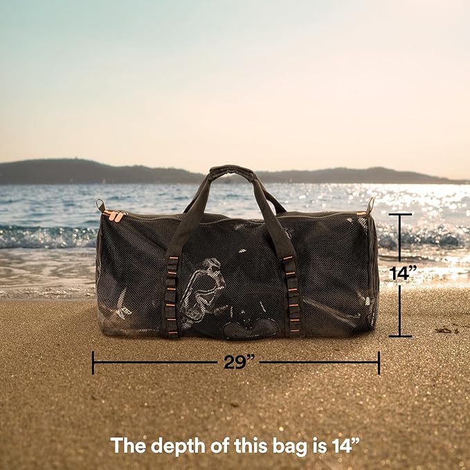 • KEEP YOU GEARS DRY AND CLEAN WITH EASE – Size at 29”x14”x14”, it is constructed from water resistant mesh which helps to keep your gears dry fast. Never have to worry about mildew built up or losing your equipment in the sun, just place them in the bag and let nature do its job. Having problems with sand in the bag? No worry, just shake it off through the mesh.