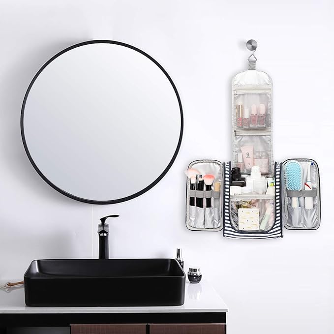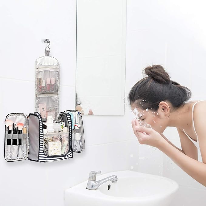 - Sturdy Hook Design - Buit-in hook allows hanging the toiletry kit from towel rack, coat hook or whereever is available, making your toiletries and cosmetics displayed well for easy access and save space as well.