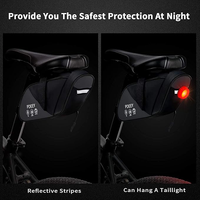 - 【DUAL SAFE PROTECTION】This cycling accessories storage is designed with reflective signs on the three sides of the bag, it can reflect light from any direction, the saddle bag can be found easily. The reflective tape on the back of the bag can also be used as a mounting ring to install tail lights to improve safety and visibility, which can protect your night riding safety