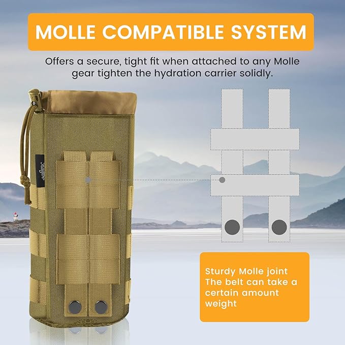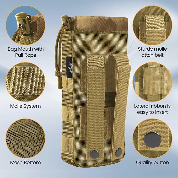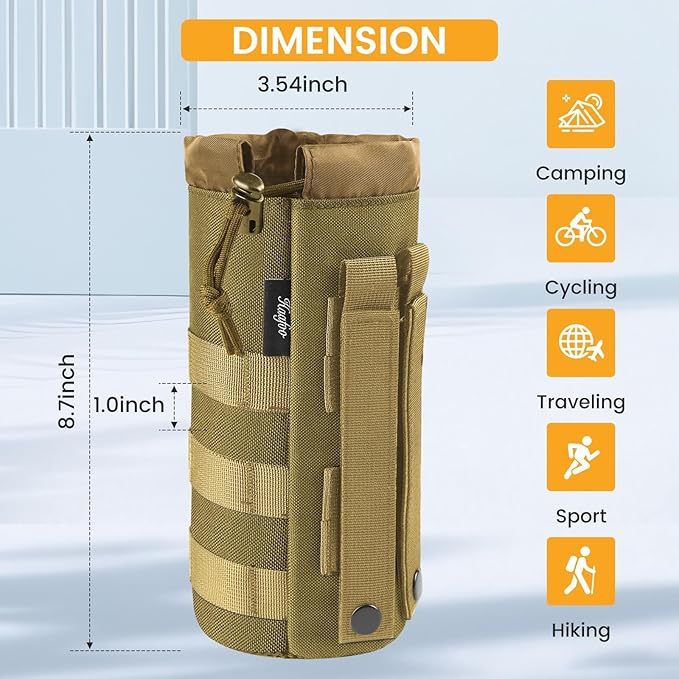 - 【 UNIVERSAL FITS 】 - Perfect size of 3.55"(D)x9.45"(H), this tactical water bottle pouch bag fits most standard size water bottles (0.5L Smartwater), one size fits most.