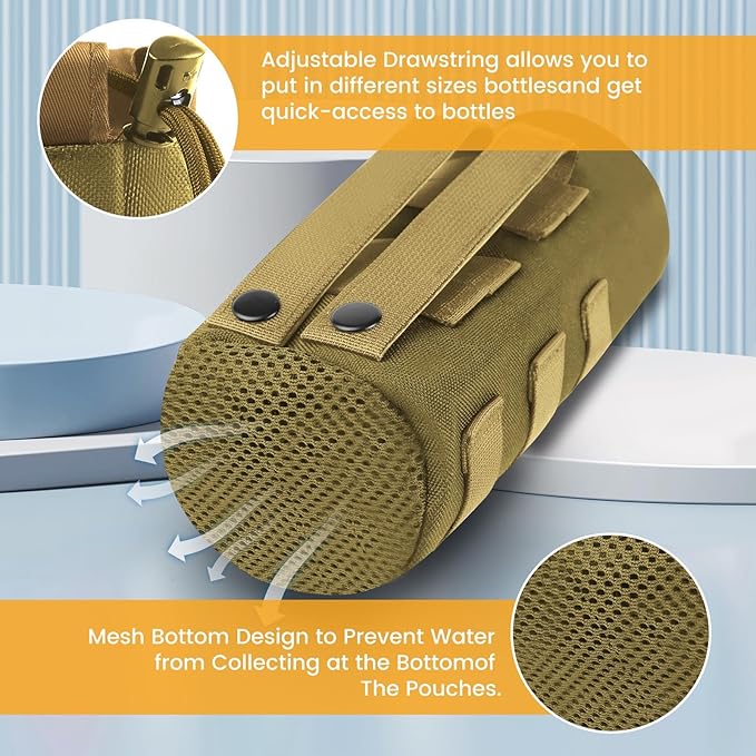 - 【 MOLLE WATER POUCH 】 - Molle system tactical water pouch bags, drawstring open top and bottom mesh lining, excellent flexibility makes the pouch easy to use and release, prevents water from gathering at the bottom.