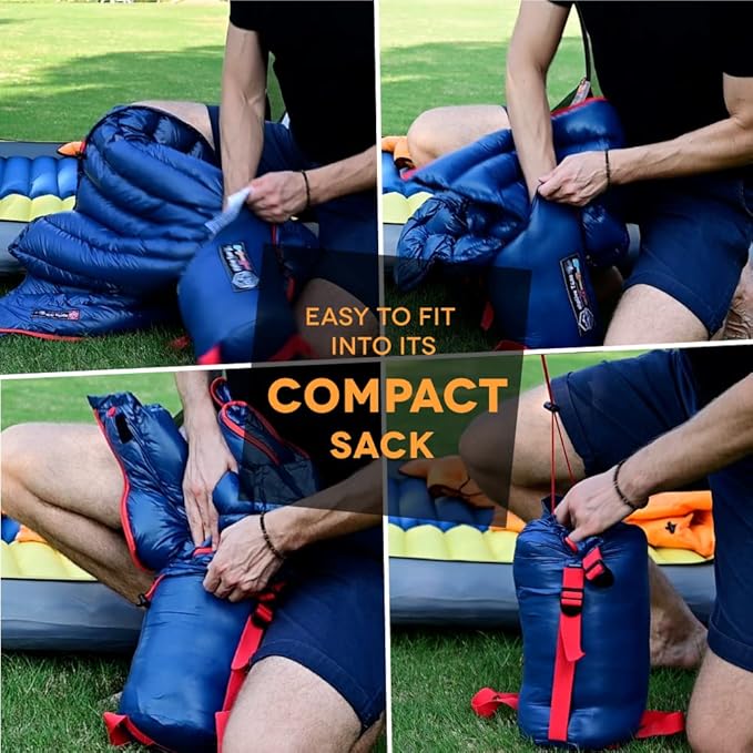- ✅ LONG LASTING DURABILITY - Premium 650-fill down offers excellent warmth-to-weight ratio, protects insulation from heat-robbing moisture, Tough 20D nylon shell fabric is treated with a durable water-repellent finish to shrug off moisture. Two of 2-way YKK zippers has an antisnag slider to reduce snagging, makes getting in and out of the sleeping bag a breeze through.