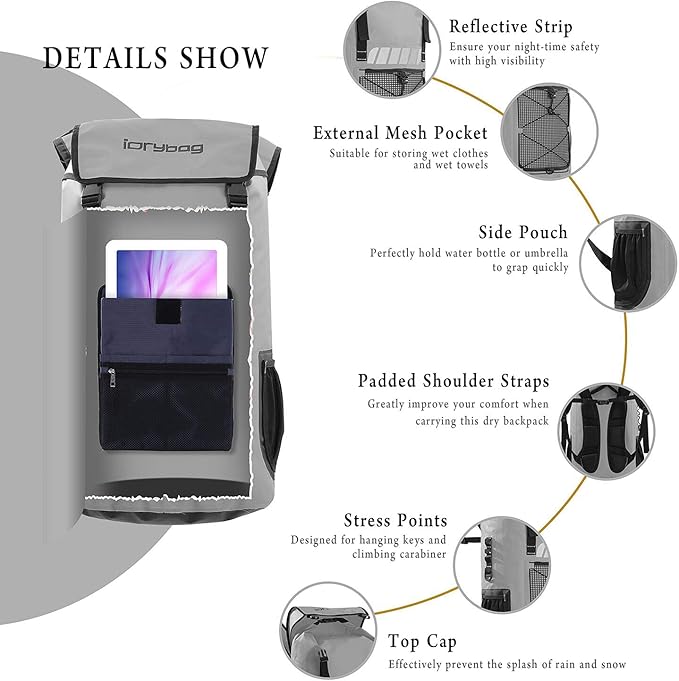 • Scientific Design: Sponge filled shoulder straps greatly improve the comfort when you carry this waterproof backpack. External mesh pocket works well for dry and wet separation. You can store wet clothes and wet towels without dampening the contents of dry backpack. Side pouch is perfect for putting water bottle and umbrella to grab quickly. Besides, we set a reflective strip on this dry bag, which is highly visible and also has a warning effect at night. That means your safety is assured.
