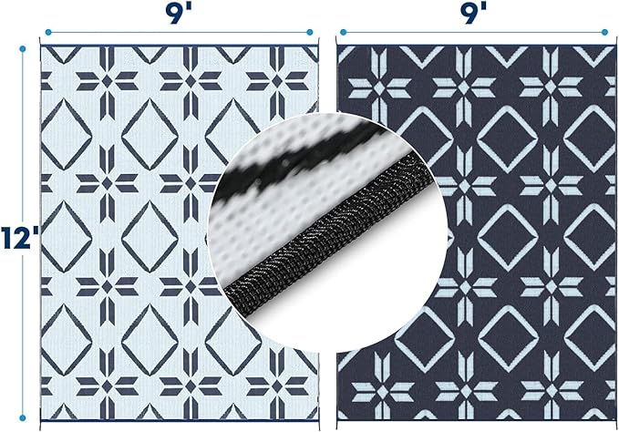 Kohree RV Outdoor Rug 9x12 Reversible, Waterproof RV Awning Rug Patio Mat with 4 Stakes & UV Resistant, Non-Slip Outdoor Camping Mat for Picnic, Backyard, Includes Carry Bag (Blue)
