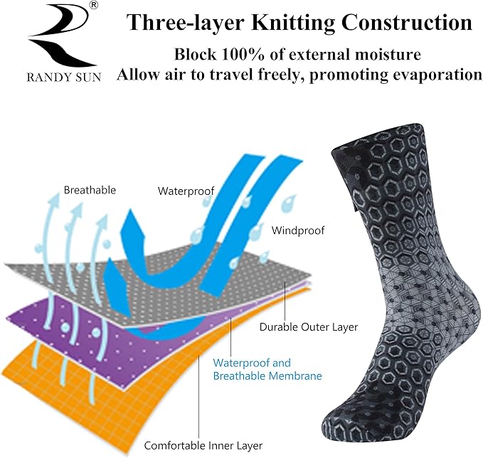 - 100% Waterproof&Breathable: RANDY SUN membrane are designed with a Three-Layer Knitting Construction, which handily solves the contradiction between Waterproofing and Breathing property. Waterproof and breathable membrane not only prevent the external water molecules from entering the socks but also drain water out of your body by COOL MAX CORE technology. Keep your feet dry and health! Three layers structure not only ensures optimal shock absorption,but also protects your feet from sand.