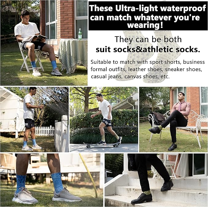 - Good Performance: These Ultra-thin waterproof-breathable socks keep your feet dry and Comfortable in wet conditions without adding bulk or sacrificing comfort – no plastic bag feeling like other waterproof socks. No smell, no stinky feet, even after a full super-active day. Reinforced heel and toe provide outstanding durability. Seamless design minimizes friction and no worry about blisters come to your feet after all-day wear.