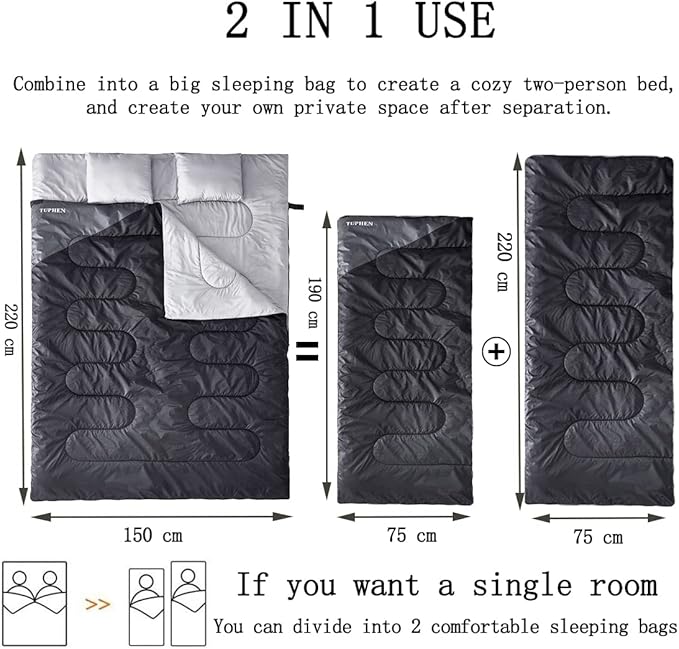 - Dual Usage: The double sleeping bag , which fits two happy campers comfortably, and can be disassembled by a zipper to become two independent sleeping bags.Imagine the memories you will leave with it.