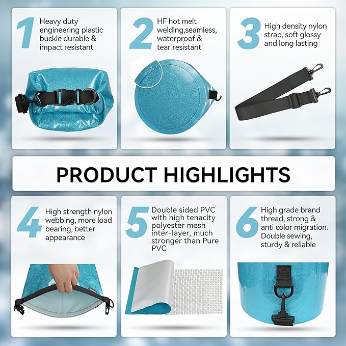 - Floatable and Trackable: The dry sack can float on water without sinking after being rolled up and buckled, so you can quickly track and retrieve your stuff. The D-ring and strap on the bag make it easy to attach to the boat, keeping your stuff always with you without getting lost, allowing you to enjoy thrilling outdoor activities with peace of mind.