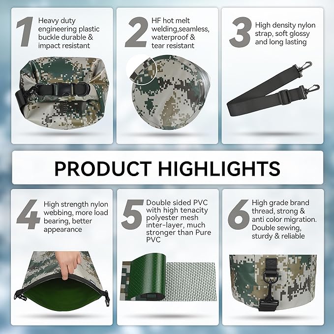 - Versatility: Its outstanding waterproof performance, durability and practical design make it a reliable companion on any water adventures, such as paddling, sailing, canoeing, surfing, river tubing, snowboarding, climbing, hunting, water park and beach trips. It can also be used as a simple bag for daily hiking or traveling during the rainy season.