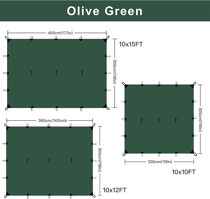 - 【LIGHTWEIGHT & PORTABLE】Our waterproof camping tarp Includes 6 guy lines, 6 stakes, 6 heavy duty black tarp clips and 1 carrying bag. Open size is 118in x 142in / 300cm x 360cm, about 1kg(2.2lb). Our camp tarp comes with a portable designed storage bag for easier carrying. Unfold the camping tarp and lay it on ground use as tent footprint; with the stakes and ropes when take it as sun canopy or rain fly