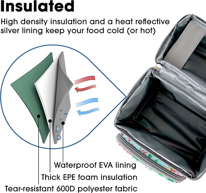 - Insulated — High density insulation and a heat reflective silver lining keep your food cold (or hot) in this thermal lunch bag
