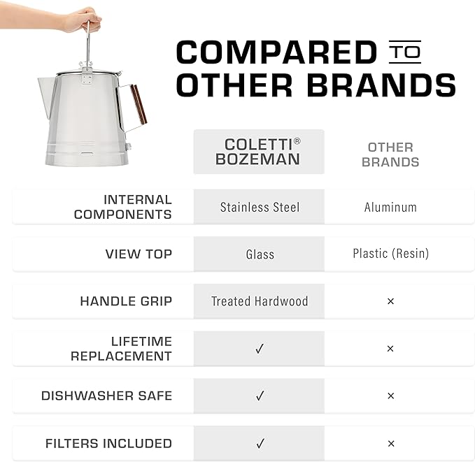 - LIFETIME REPLACEMENT GUARANTEE—BUILT TO LAST – At COLETTI, we build gear to outlast the trail. If anything happens to your camp coffee pot, we’ll replace it—no questions asked. US-based customer service ensures help is just a call away, so you can brew with confidence on every adventure.