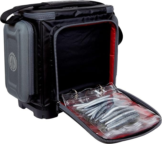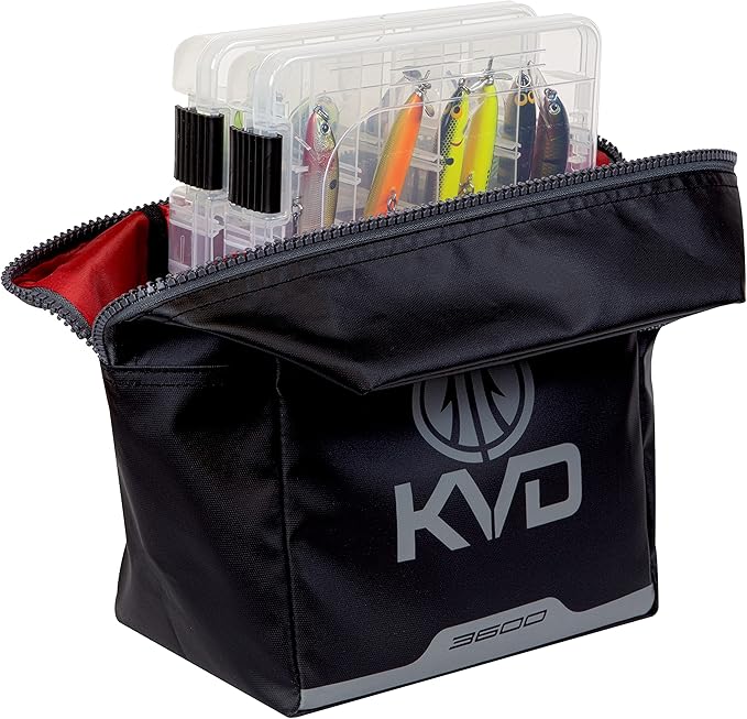- WATER-RESISTANT TPE COATED FABRIC keeps your soft plastics in pristine shape. Features heavy-duty molded zipper, durable carry handle, and KVD Signature design elements.