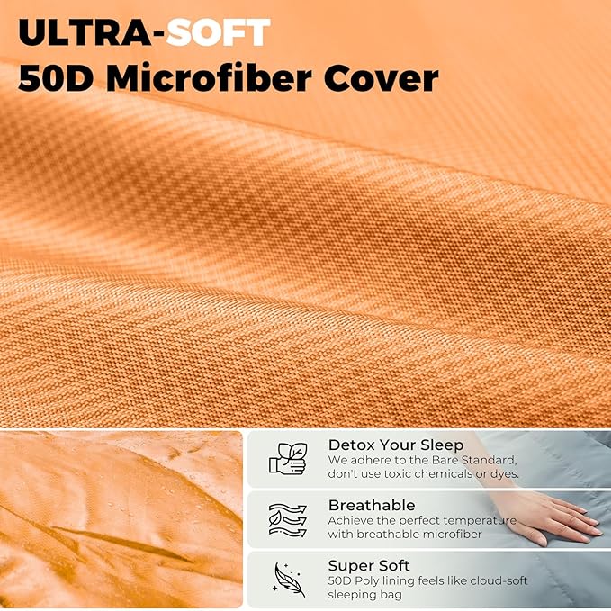 - DURABLE & WATER-RESISTANT-Built for the Outdoors: Crafted with 50D ripstop fabric, this sleeping bag is designed to withstand the rigors of outdoor life. It’s resistant to abrasions and friction, ensuring long-lasting durability even in harsh conditions. The water-resistant material helps keep you dry, even in damp environments, so you can stay comfortable in a variety of weather conditions. Additionally, YKK zippers add an extra layer of durability, ensuring smooth operation and longevity.
