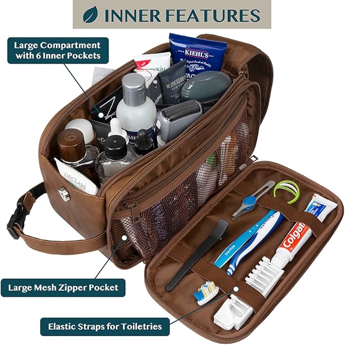 - MENS TOILETRY BAG: This functional PU leather toiletry travel bag has a large compartment and side pockets with additional pockets to hold all your toiletry, shaving, and grooming accessories. Equipped with elastic bands and additional mesh pockets to keep your hygiene items secured while traveling or at home, this cosmetic make up case will help you stay organized.