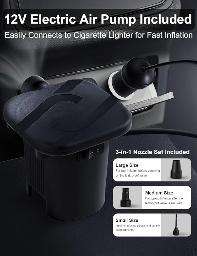 - Complete Accessory Set: Comes with 2 inflatable pillows, an electric air pump with a 3-meter cord, repair patches, and a storage bag—everything you need for a smooth, worry-free setup. We also provide 1-year after-sales service. If you encounter any issues, feel free to contact us at any time.