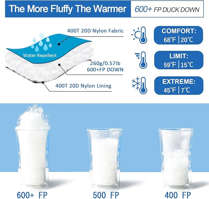 - ใ ๐๐๐๐ ๐๐๐๐ ใThe adult sleeping bag is filled with 260g selected duck down with 600 Fill Power, suitable for warm weather. Pure natural and healthy material, fluffy and soft, no odor or impurities. The sleeping bag specially adds a 1.6 " cloth strips for wind protection. Comfortable Temperature:59ยฐF-68ยฐF, Minimum Temperature: 45ยฐF.