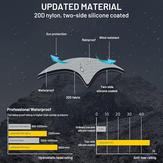 - SUPER WATERPROOF TENT: It's constructed from 20D nylon from the rainfly to the floor making it more durable and waterproof than the standard version. Seam-taped rainfly (20D nylon, two-side silicone coated/PU 2000mm) and bathtub floor (20D nylon, silicone/PU 5000mm). The tent is as strong although it is lighter. Solid as a rock in the windy storm and it also holds up to hail and thunderstorms. Anti-UV and tear resistant