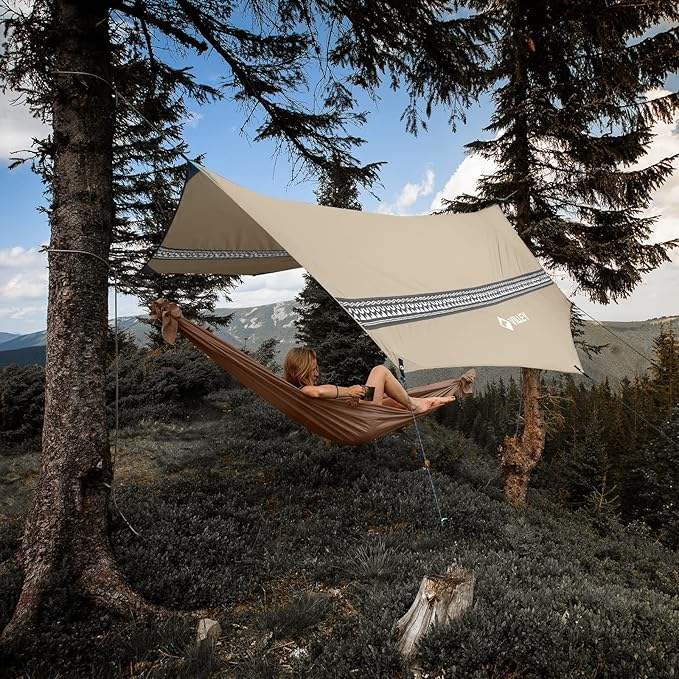 - Waterproof & UV Protection: Hammock Camping Tarp comes with fully taped seam construction and is made of no-snag PU-coated 210D polyester Oxford fabric that lets you pitch it tight, essential when the weather gets foul. The VILLEY's backpacking tarp kept us well-shaded and cool in the summer heat, and can effectively block ultraviolet rays from UPF 50+ to protect your skin against the sun