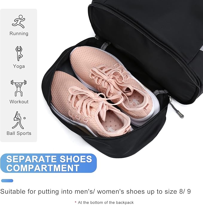 Coofay Gym Backpack for Women - Waterproof With Shoe Compartment, Lightweight Travel and Sports Bag, Large Black