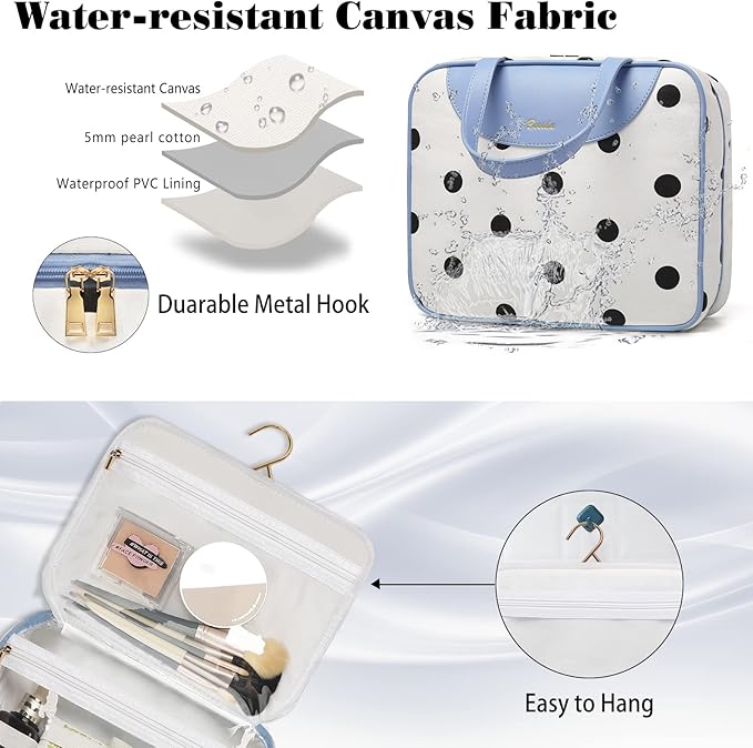 - Premium Quality Canvas Material: Made of soft and water-resistant material; Main compartment is visible for easy access, and the inner PVC material is great for protecting the toiletry bag from being wet.