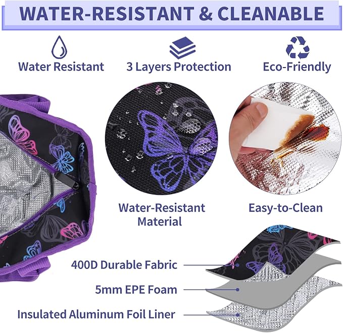 Lunch Bags for Women,VONXURY lnsulated Thermal Adult Lunch Box Large High-capacity Cooler Lunch Tote with Detachable Shoulder Strap for Work College Travel Picnic (Black Butterfly)
