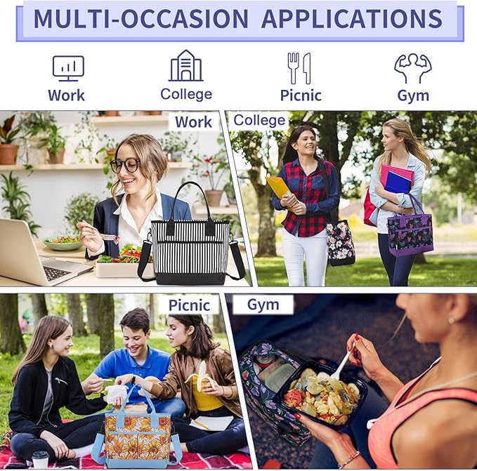 - MULTIPLE CARRYING OPTIONS:Shoulder strap: at 139 cm/ 54.7 inch maximum length.Coming with an detachable shoulder strap and reinforced top handle,the lunch purse offers multiple carrying options for you to take food and drinks to work, college, picnics, beach, road trips, camping, travelling or any outdoor activities.You could easily carry it on your shoudler,put it across your body or take it by the top handle.