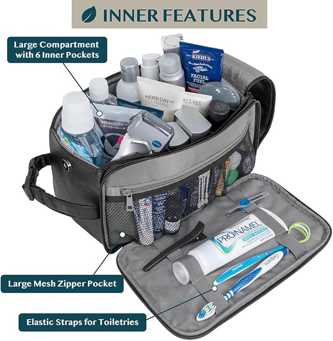 - MENS TOILETRY BAG: This functional PU leather toiletry travel bag has a large compartment and side pockets with additional pockets to hold all your toiletry, shaving, and grooming accessories. Equipped with elastic bands and additional mesh pockets to keep your hygiene items secured while traveling or at home, this cosmetic make up case will help you stay organized.