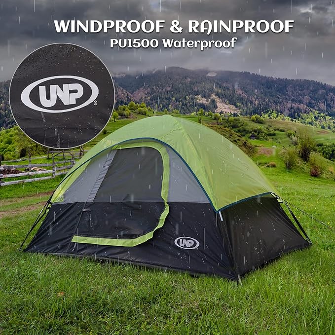 - 【Windproof & Rainproof 】:The camping tent is made of stronger tear-resistant polyester.It come with a removable rainfly and two zippers designed for keeping the rain outside the tent. The ropes of tent and piles ensure safety and stability.